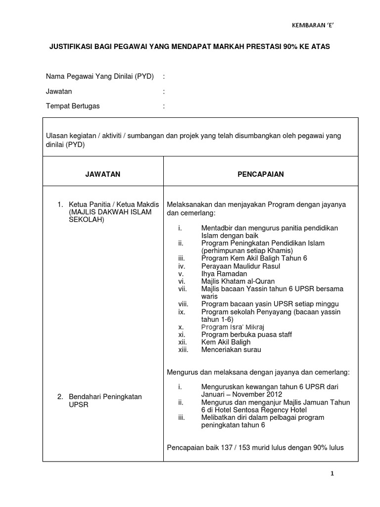 Contoh Justifikasi Penilaian Prestasi