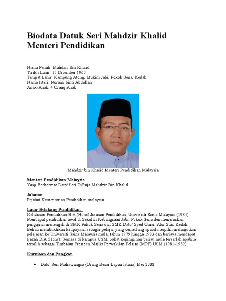 Biodata Datuk Seri Mahdzir Khalid Menteri Pendidikan Docx