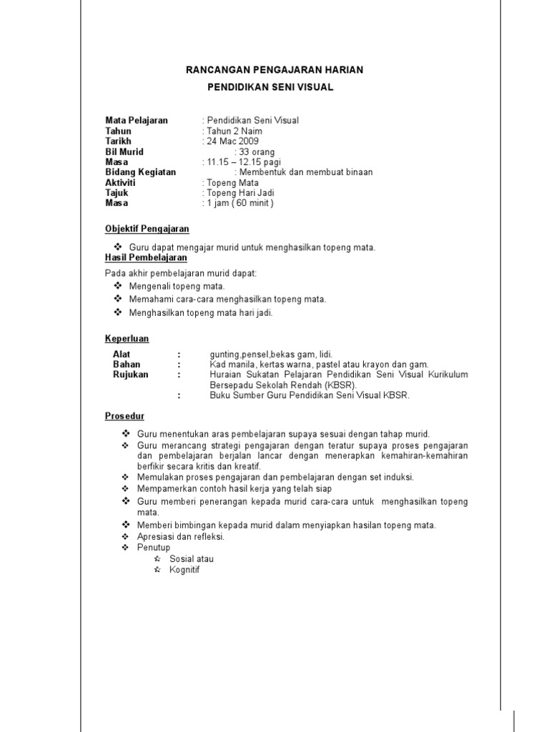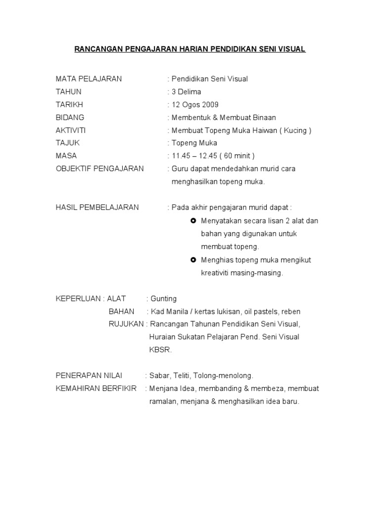 Rancangan Pengajaran Harian Pendidikan Kesenian Tahun 2
