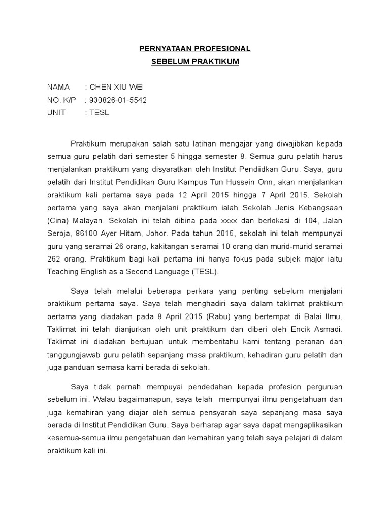 Doc Pernyataan Profesional Internship 2012 Sebelum Internship Yamunah Subramaniam Academia Edu