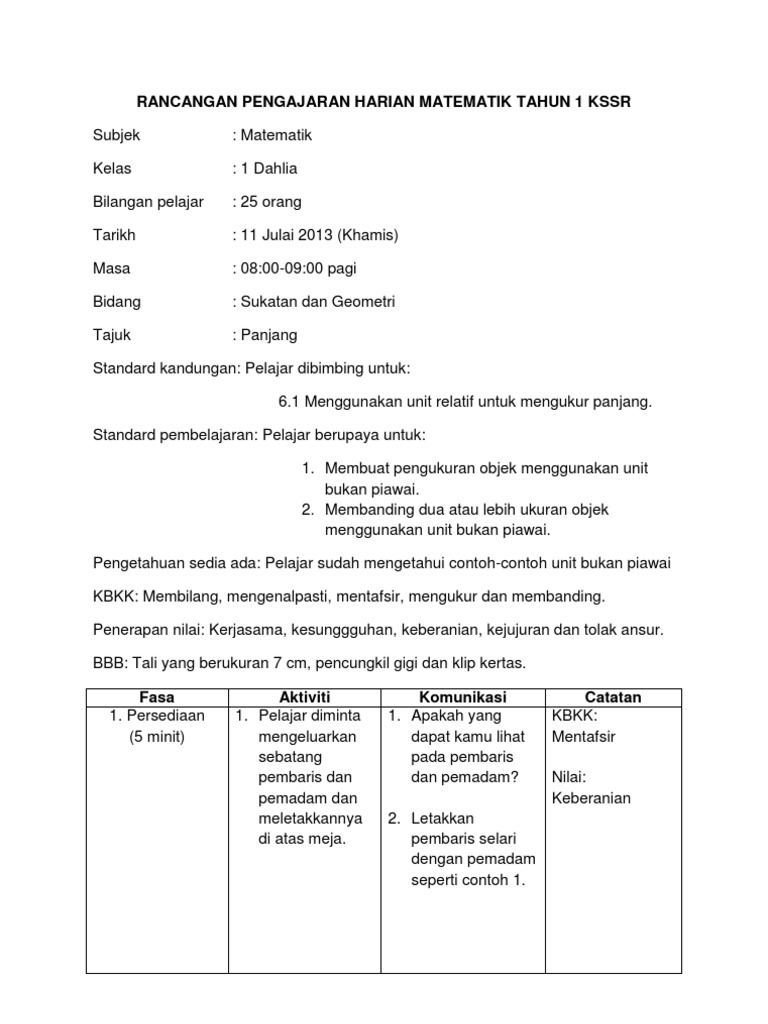 Contoh Rph Matematik Tahun 3 Kssr Semakan