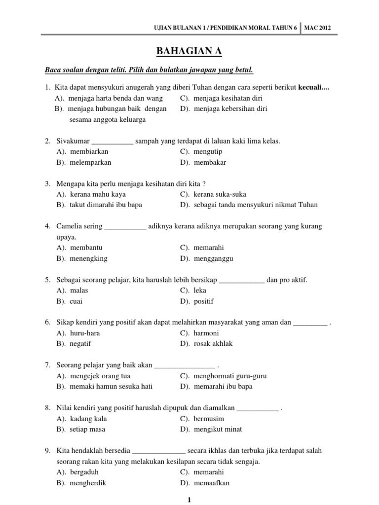 Ujian Mac Pendidikan Moral Tahun 6 Sumber Pendidikan